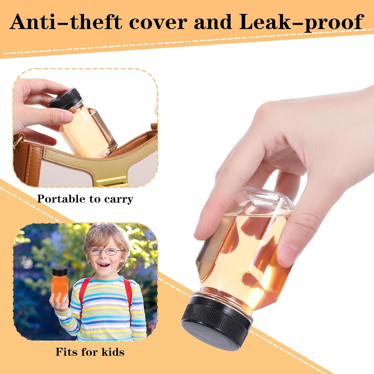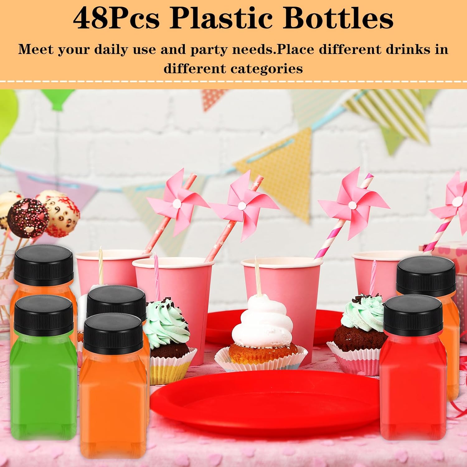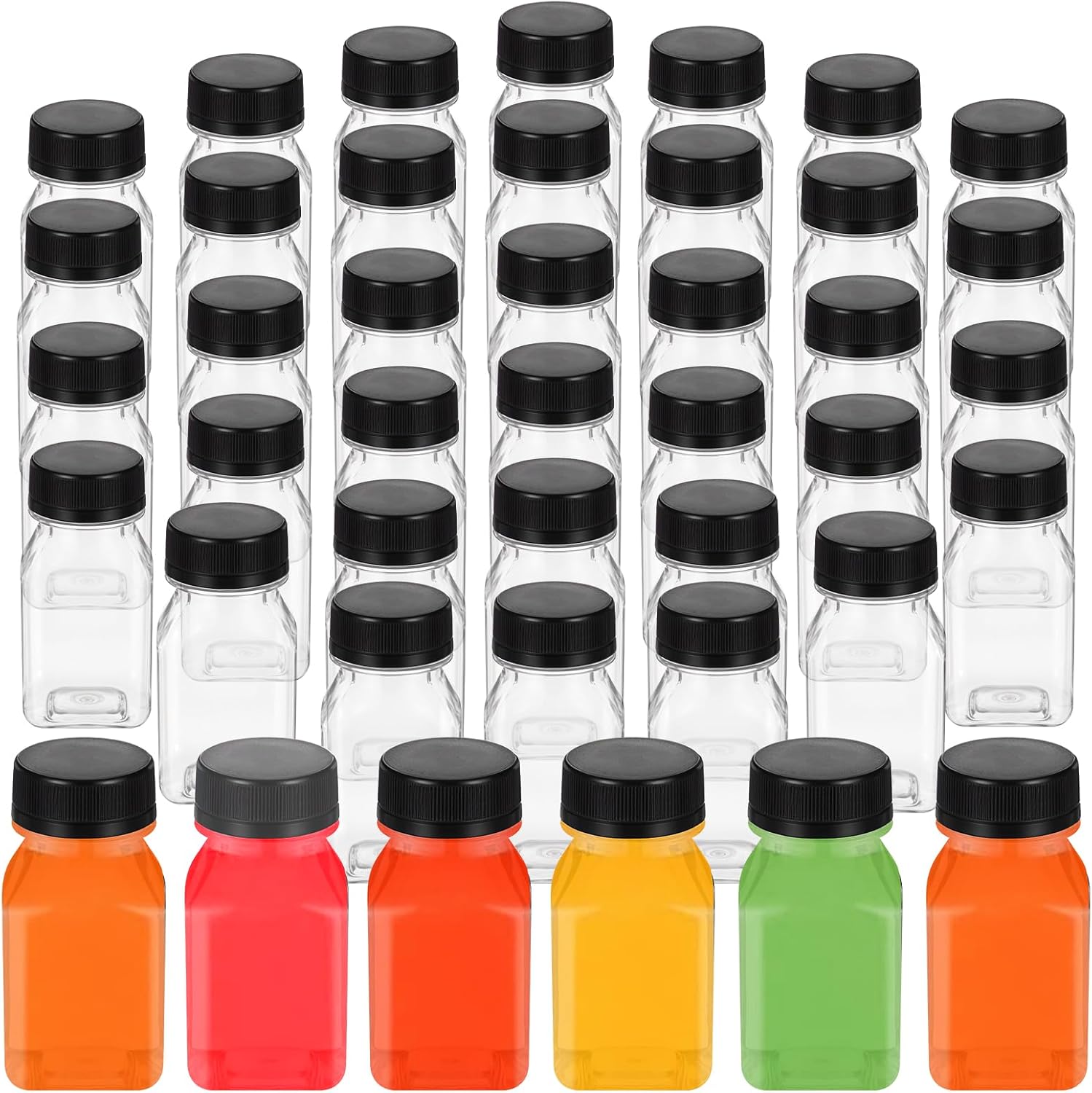 Features:Proper CapacityThe clear juice bottles with caps are about 4 oz/ 120 ml, suitable for holding many different drinks and beverages, such as milk, juice, water, soda water, coffee, liquids, tea and more, ideal for both kids and adultsReliable and SafeThe containers are made of quality PET material, reliable and BPA free, odorless and safe, not easy to break or fracture, serving you for a long time; Please note that the bottle is not suitable for too hot drinksMaterial: PET Specifications:Color: clearSize: 1.8 x1.5 x3.75 inPackage includes:48 x Juice BottlesNotes:Manual measurement, please allow slight errors on size.The color may exist a slight difference due to different screen displays.