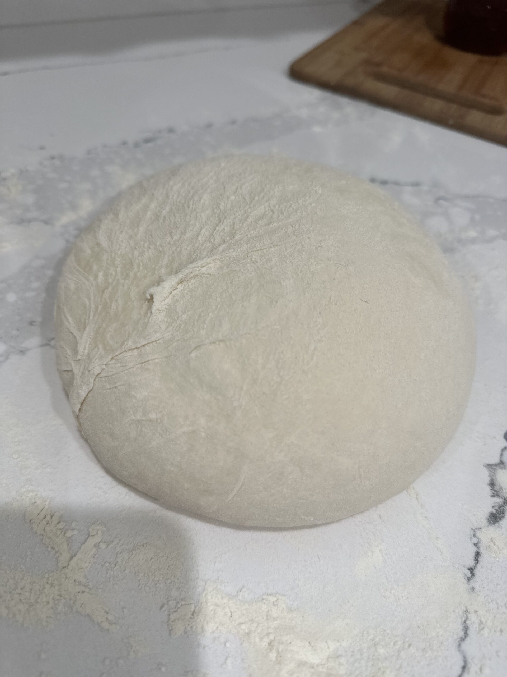 - Flour your hands and begin to knead the dough a few times then flip the dough over and “shape”it. This means your tuck under the dough to create a smooth top and round shape.