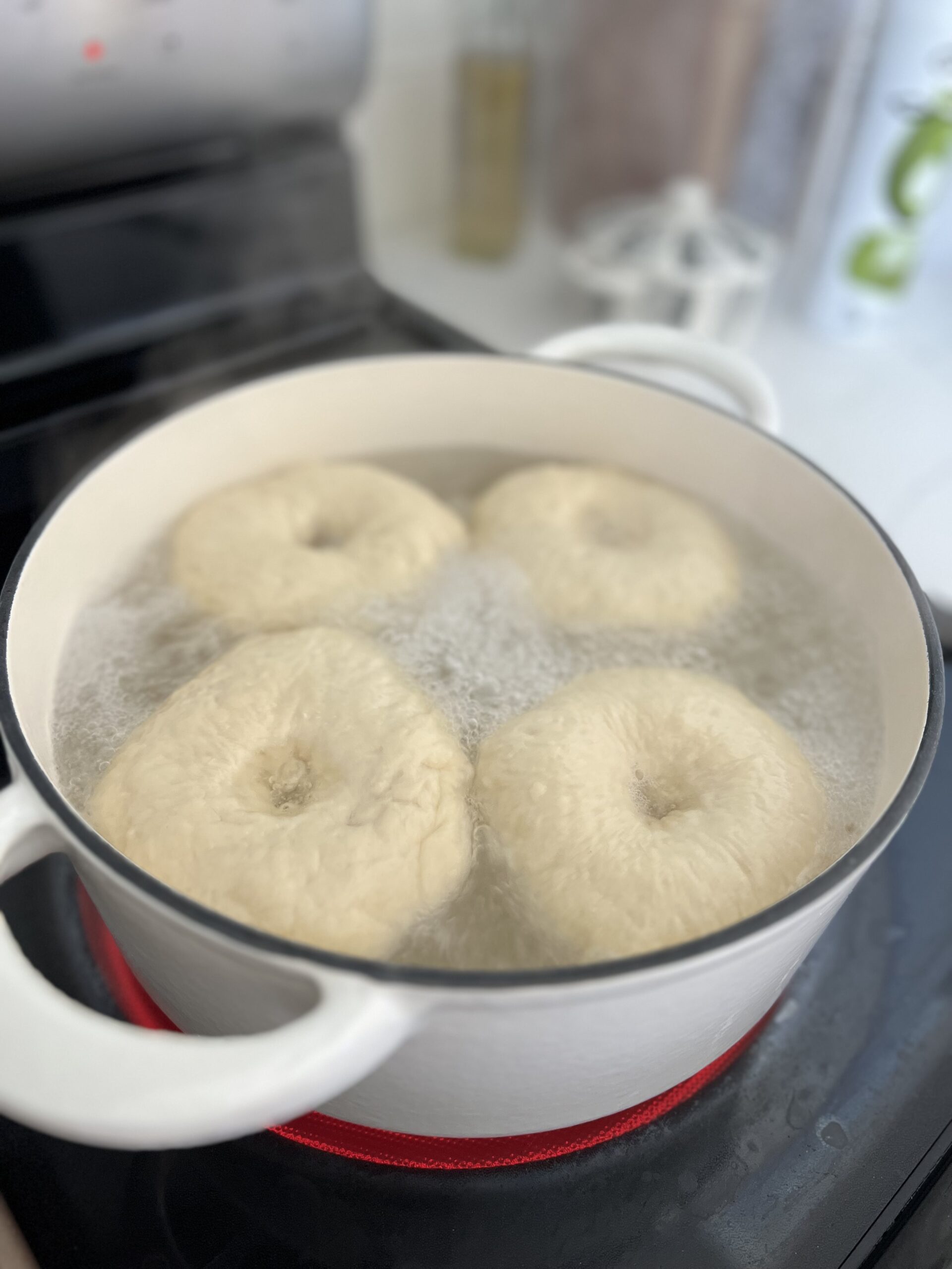 - Place 3-4 bagels as many will fit in the boiling water and let boil for 2 minutes and then flip them for another 2 minutes