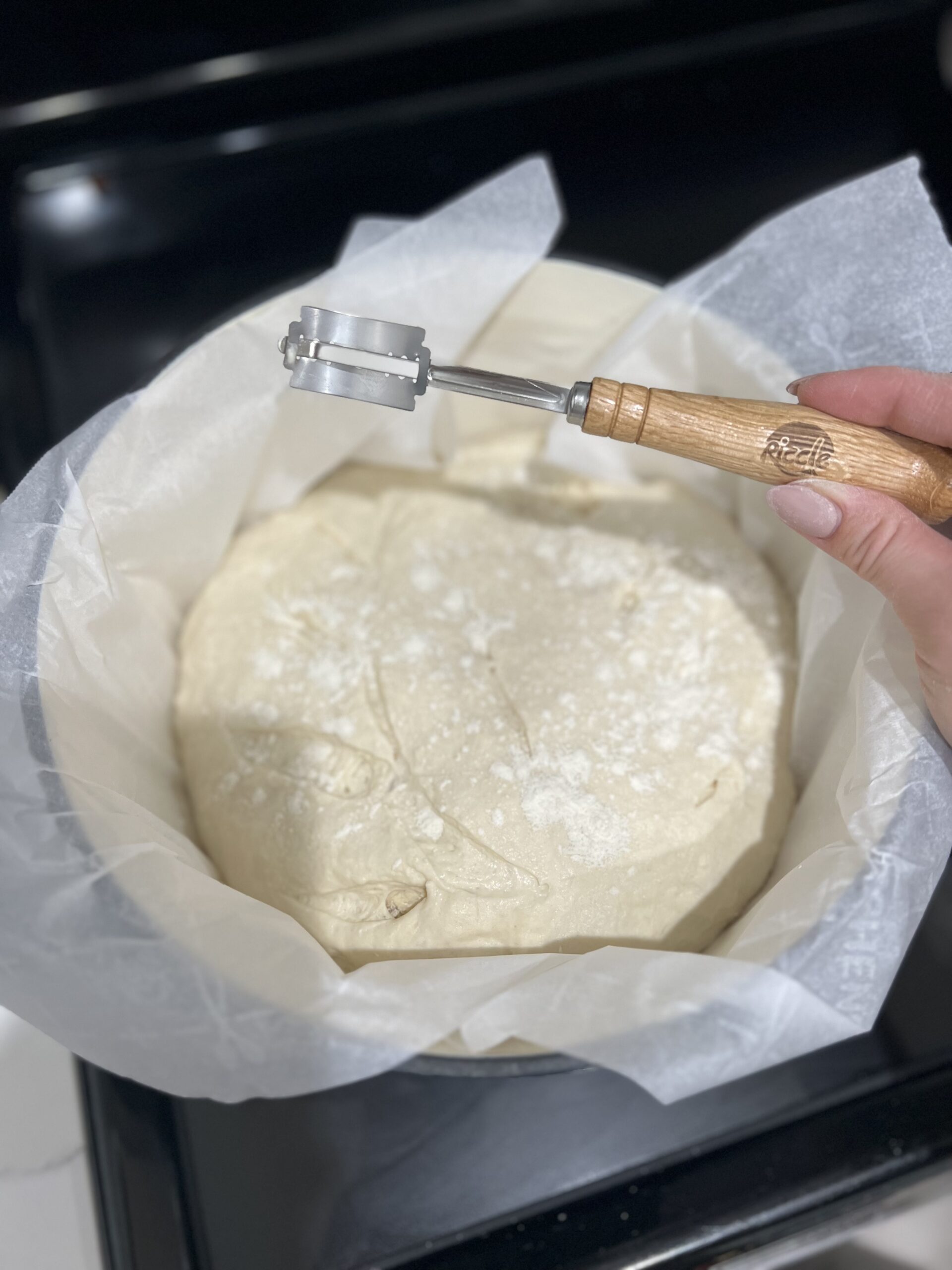 - Once the dough has finished the second rise it should have risen to almost twice the size it was. Then using a blade you get to score the dough. (This is when you see those beautiful designs come to life that people do but at a minimum just cut two ( ) on top so the dough can expand in the oven) if you want you can sprinkle some flour on top after you score just for esthetic.